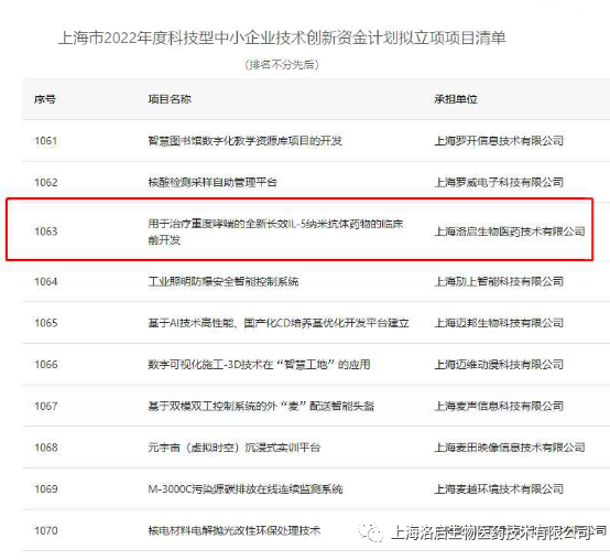 近期,上海市科学技术委员会组织的“上海市2022年度科技型中小企业技术创新资金计划”拟立项项目名单公示完毕,凯发K8天生赢家一触即发生物“用于治疗重度哮喘的全新长效IL-5纳米抗体药物的临床前开发”项目入围。